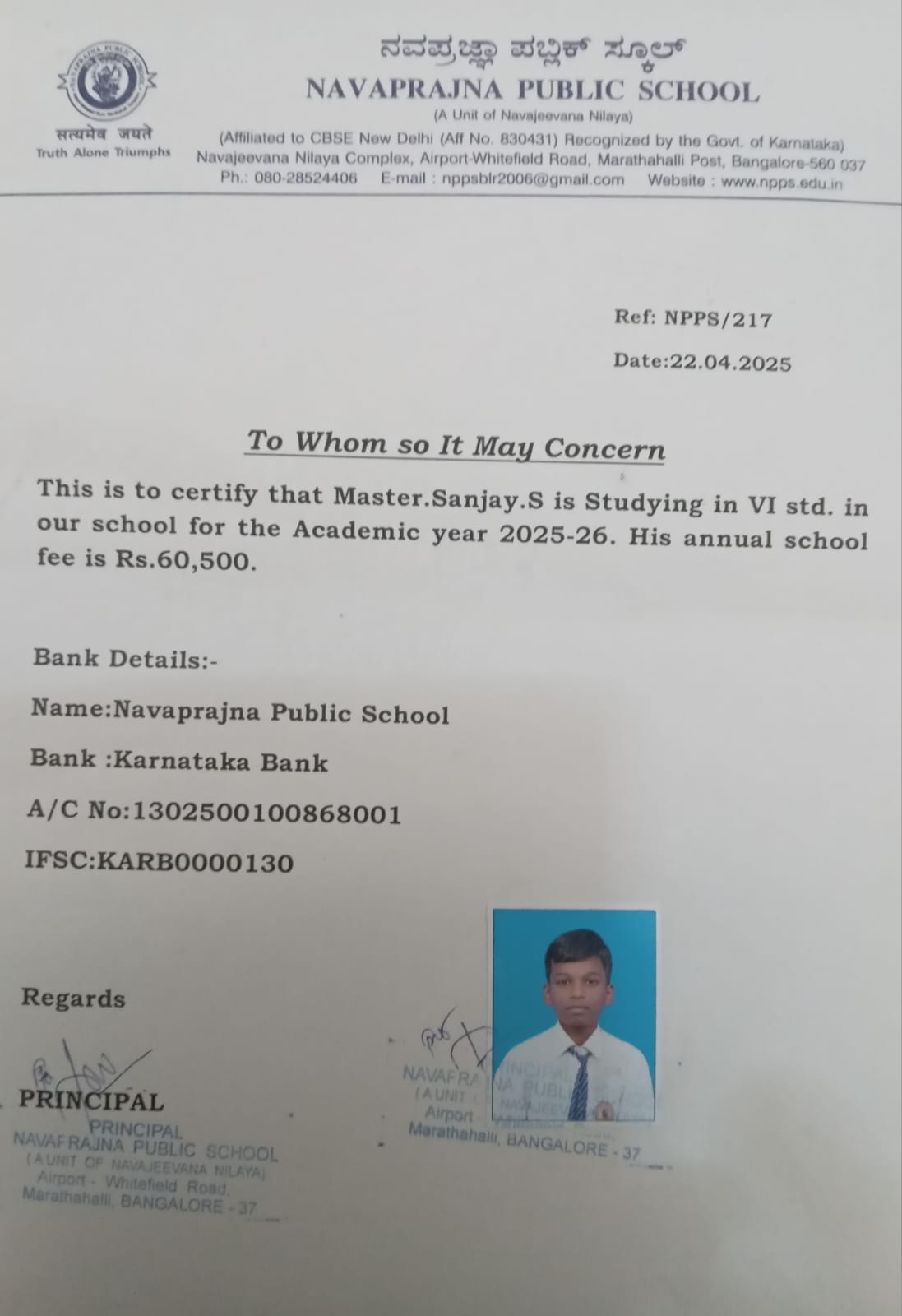 Sanjay Suresh, son of Mr Suresh Babu, studying in 6th std at Navaprajna public school needs your support to pay for his tuition fees for the academic year, 2025-26.